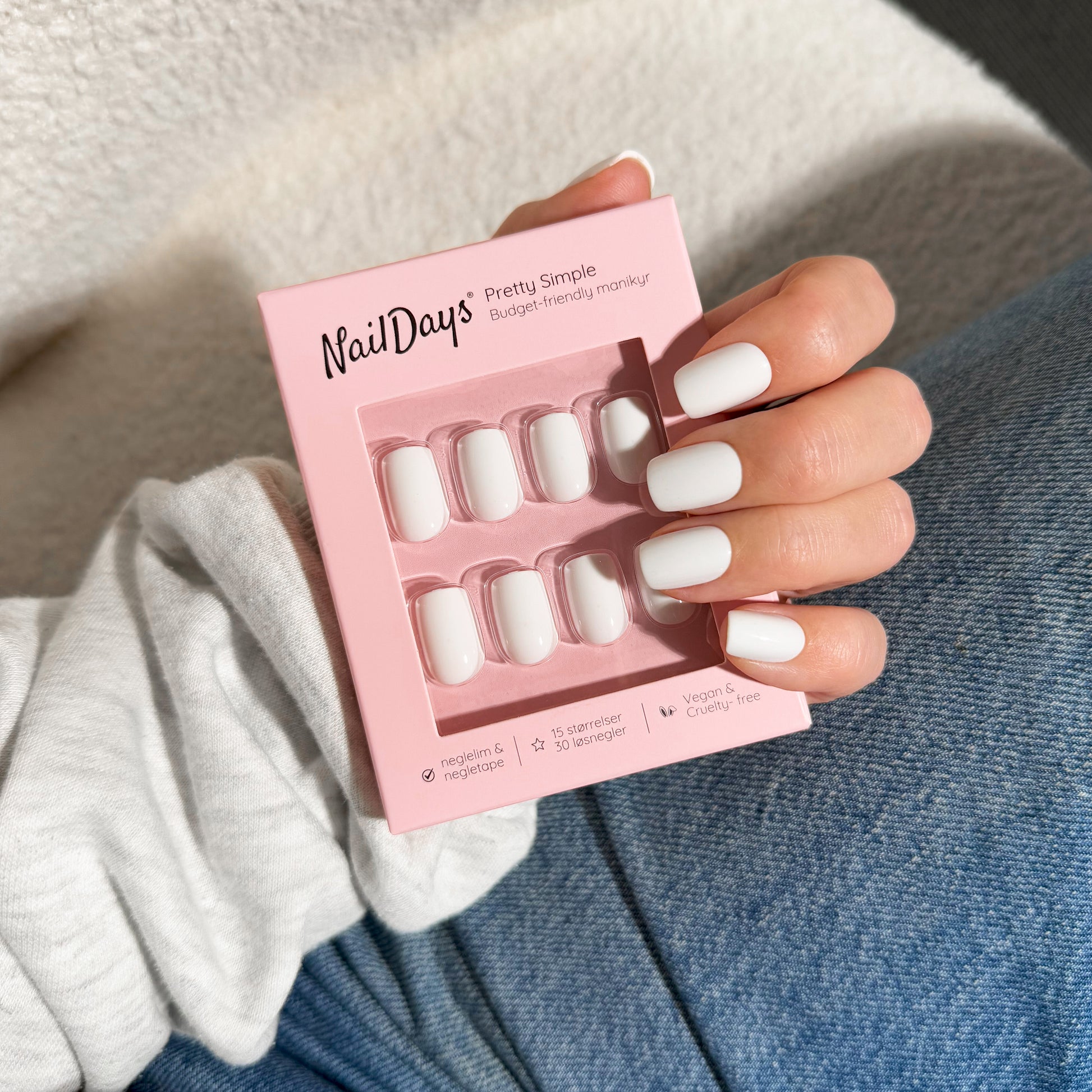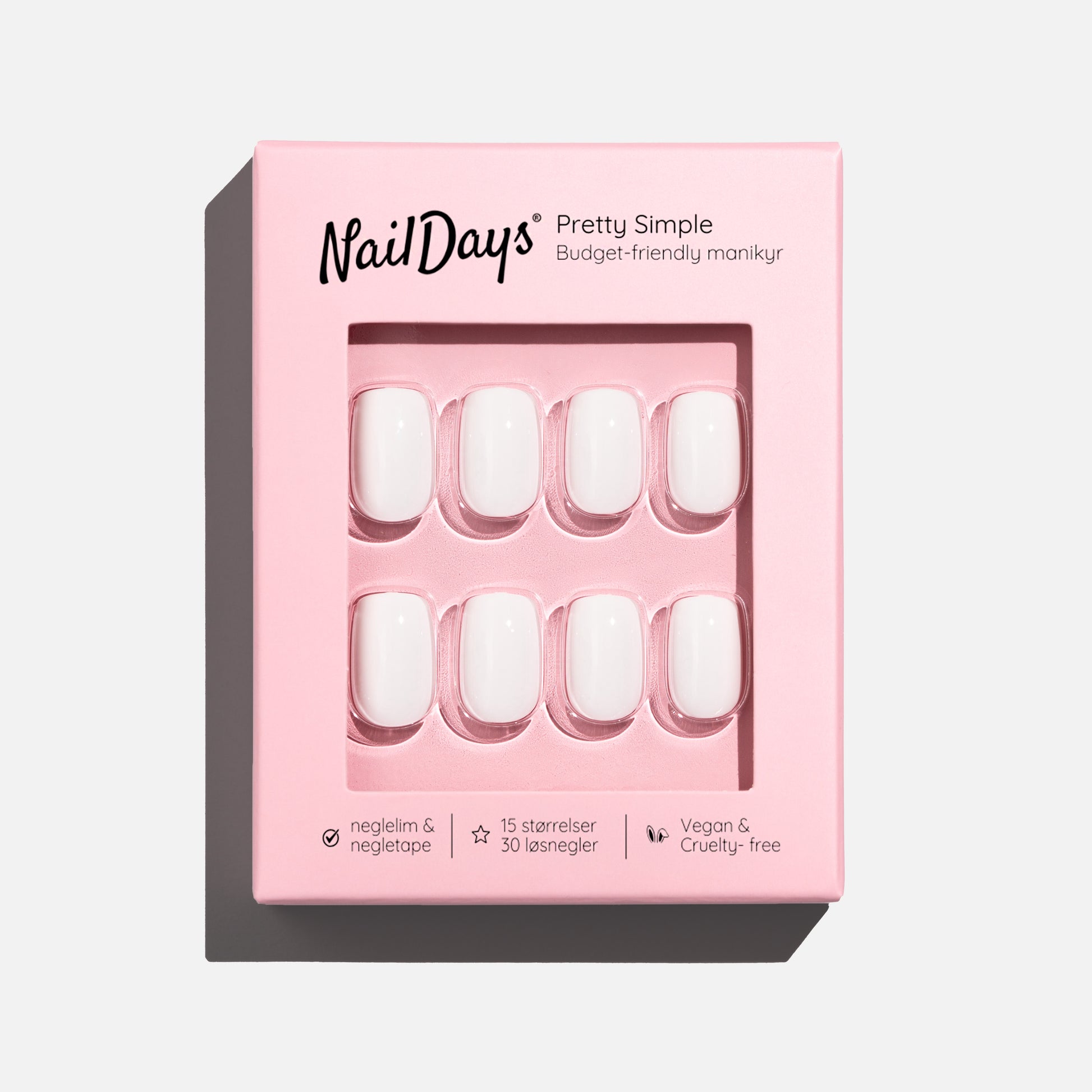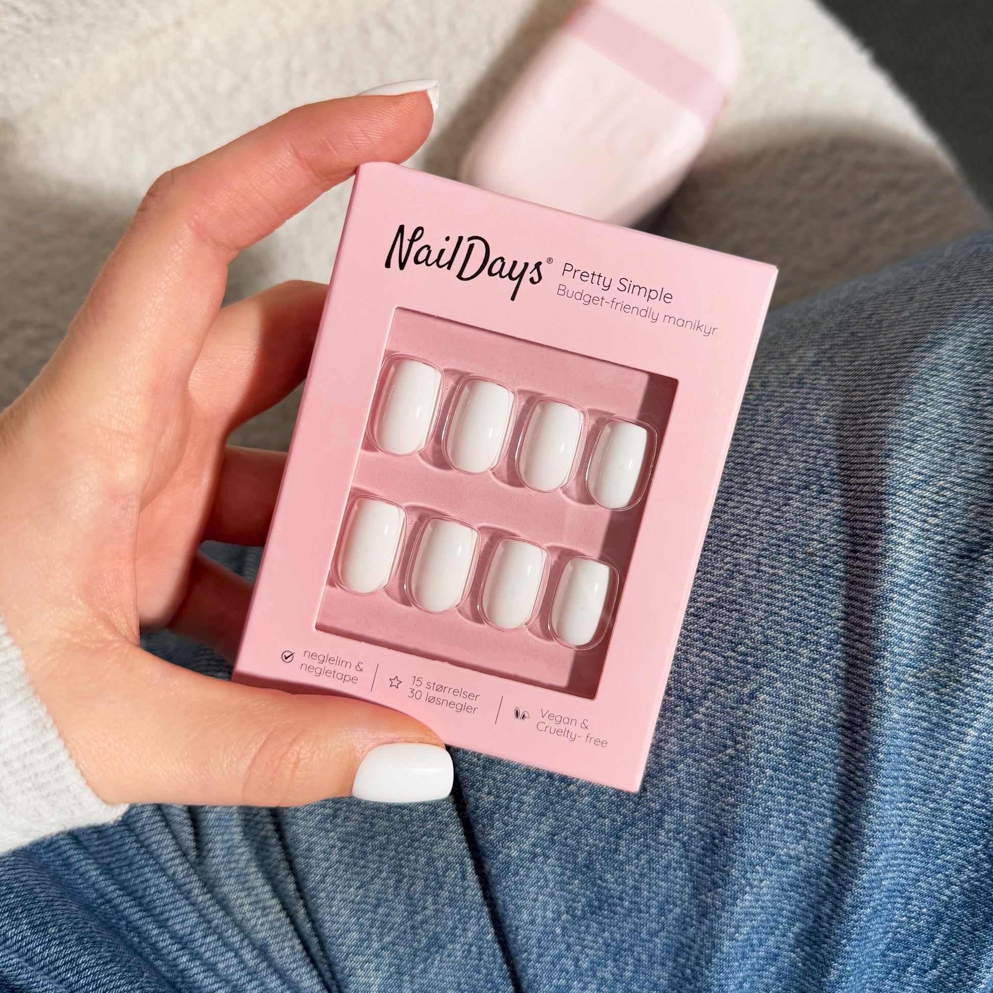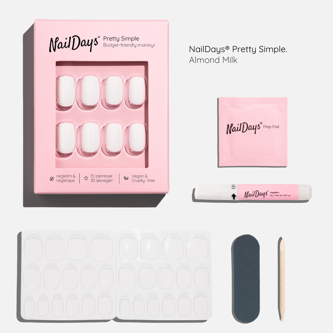 30 heldekkende løsnegler, NailDays® neglelim (2g), 2 stk. (15 biter) negletape, alkoholserviett, neglefil, treppine.