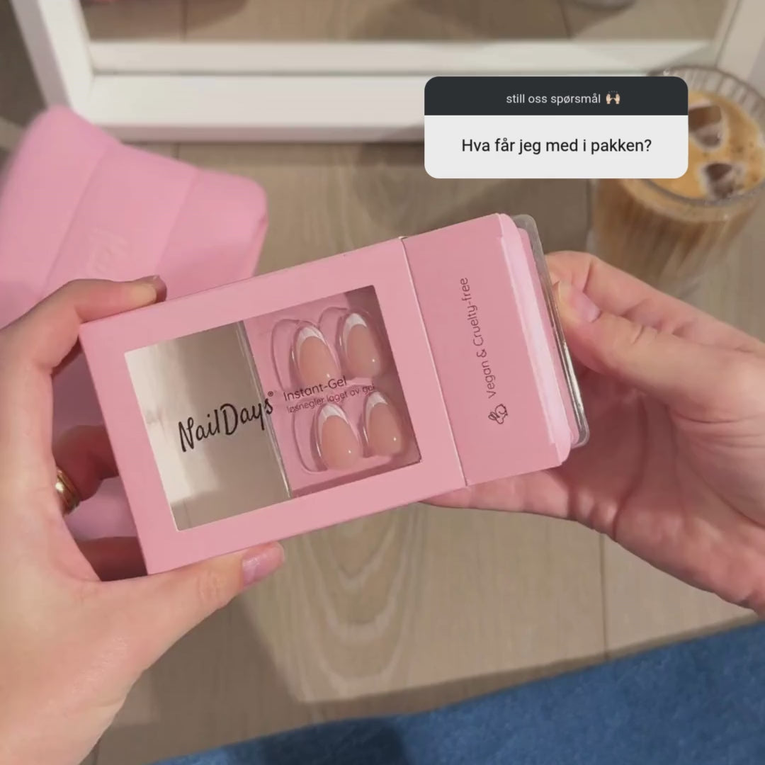 Instant-Gel 2.0 løsneglersett "Marshmallow". INNHOLD: 32 løsnegler, NailDays® brush-on neglelim (3g), x2 Prep pad, neglefil, trepinne, negletape.