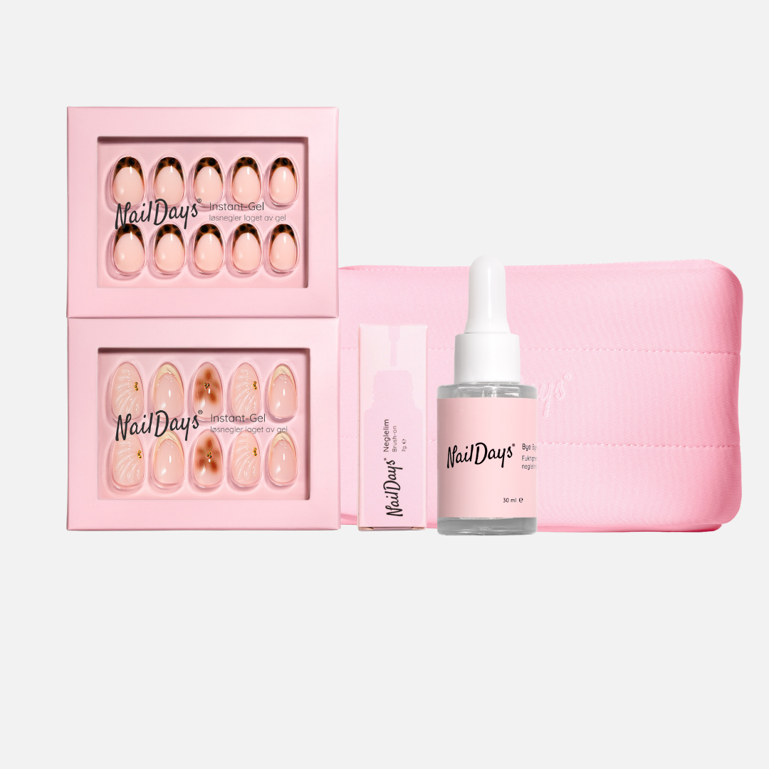 Avhengig av påsetting og bruk vil neglene holde i 2+ uker ved bruk av neglelim. Det er enkelt å sette på NailDays® løsnegler ved hjelp av neglelim.